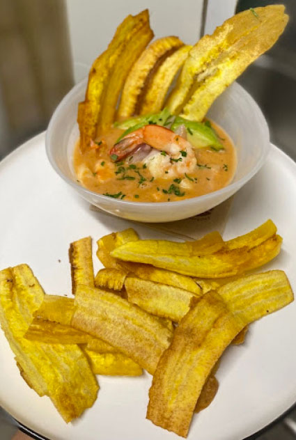 | Ecuadorian Ceviche of prawns with avocado and plantain chifles |