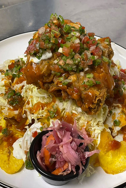 | Mixed Carne Asada beef and pork, avocado, cheese, chimol (typical sauce from Guatemala, Honduras), tajadas (sliced plantain) |